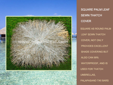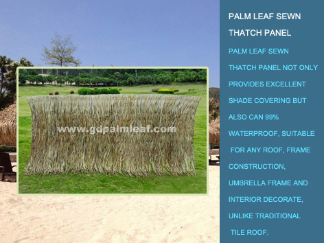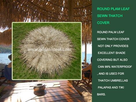 Our palm leaf thatch have palm leaf thatch cover and palm leaf thatch panel (also known as palm leaf rain cape), they are hand woven from natural palm leaves. Since palm leaves have evolved in nature to withstand the sun, the rain, and gale force winds and has excellent insulation, therefore is cozy and warm in winter and marvelously cool in summer. Palm leaf thatch is used in applications such as tiki bars, gazebos, huts and palapa umbrellas. The life span of palm leaf thatch is 2-3 years in wet humid climates, and 3-4 years in warm dry climates,used indoors it may last indefinitely.